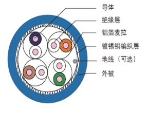 规格Item 单位Unit 典型值Specified Value 导体Conductor 线数Wire No. ---- 4对(P) 材质Material ---- 祼铜线Copper 规格Size AWG 23AWG 结构Construction No./mm 1/0.56±0.005 绝缘Insulation 材质Material ---- HDPE 外径Dia.(Approx) mm 1.0±0.05 颜色Color ---- P1 蓝、白/蓝;P2 橙、白/橙; P3 绿、白/绿;P4棕、白/棕; 包带Tape Shield 材质Material 铝箔麦拉AL-Mylar 覆盖率Coverage 100% 编织屏蔽Braiding Shield 材质Material ---- 镀锡铜Tinned Copper 覆盖率Coverage 35% 撕裂线Rip cord 材质Material ---- 尼龙绳 外被Jacket 材质Material ---- PVC 颜色Color ---- 象牙灰色 ( GY852) 翻通色号:Cool Gray 1C 厚度Thickness mm 0.55±0.005 外径Dia.(Approx) mm 7.0±0.2