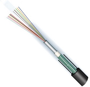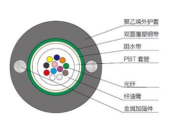 中心松套管保护一次涂覆光纤;光纤集中在光缆的中心,加强件分布在光缆护套中的钢带两侧;钢带与缆芯之间设有阻水层;