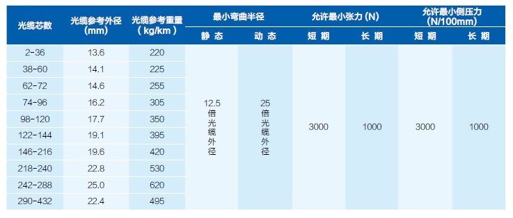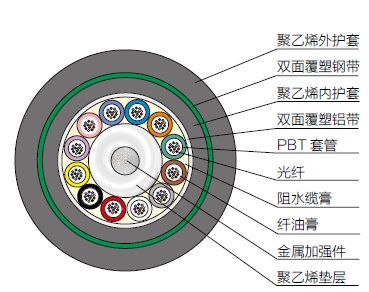 金属中心加强件 ( 磷化钢丝 );双面覆塑铝带——聚乙烯粘结内护套;双面覆塑皱纹钢带——聚乙烯粘结外护套;