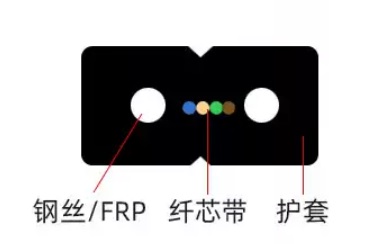 室内蝶形引入光缆是将光纤处于中心,两侧放置两根平行加强件,护套层采用低烟无卤阻燃聚烯烃(LSZH)。